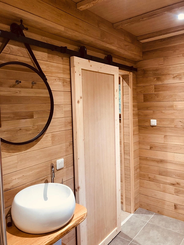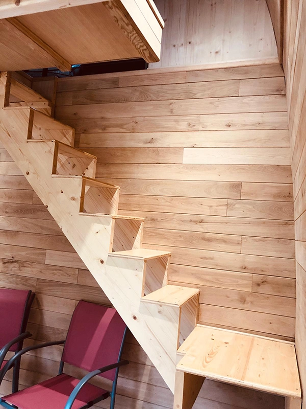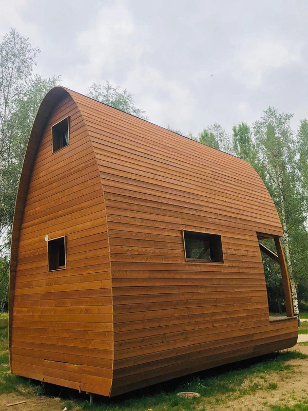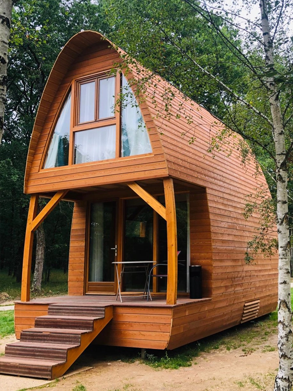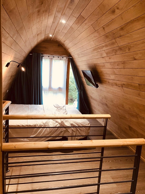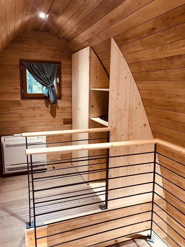 Cabane duplex arrondie, conçue sur mesure.- Sur vis de fondation- Equipée d'une salle de bain- Bardage mélèze saturé- Intérieur en lambris chêne massif